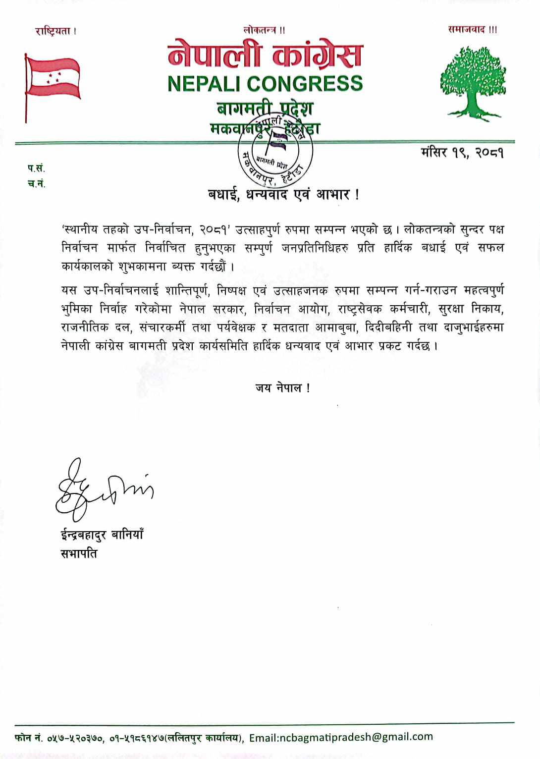 हेटौंडा । मंसिर १६ गते सम्पन्न स्थानीय तह उपनिर्वाचन शान्तिपूर्ण रुपमा सफल बनाएकोमा नेपाली कांग्रेस बागमती प्रदेश समितिले सबैप्रति आभार व्यक्त गरेको छ । कांग्रेस बागमती प्रदेश सभापति ईन्द्रबहादुर बानियाँले बुधबार एक सन्देश जारी गर्दै स्थानीय तहको उप–निर्वाचन, २०८१ उत्साहपुर्ण रुपमा सम्पन्न भएको बताए ।