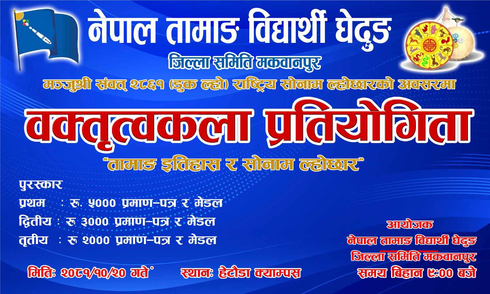 ‘तामाङ इतिहास र सोनाम ल्होछार’ विषयक वक्तृत्वकला प्रतियोगिता आयोजना गर्न लागेको तामाङ घेदुङ मकवानपुरका अध्यक्ष छोइसाङ लामा स्याङ्तानले जानकारी दिए । उनका अनुसार, हेटौंडा क्याम्पसको सभाहलमा हुने प्रतियोगिताको प्रथम, द्धितीय र तृतीयलाई क्रमशः नगद ५ हजार, ३ हजार र २ हजार रुपैयाँसहित प्रमाण पत्र र मेडल प्रदान गरिनेछ ।