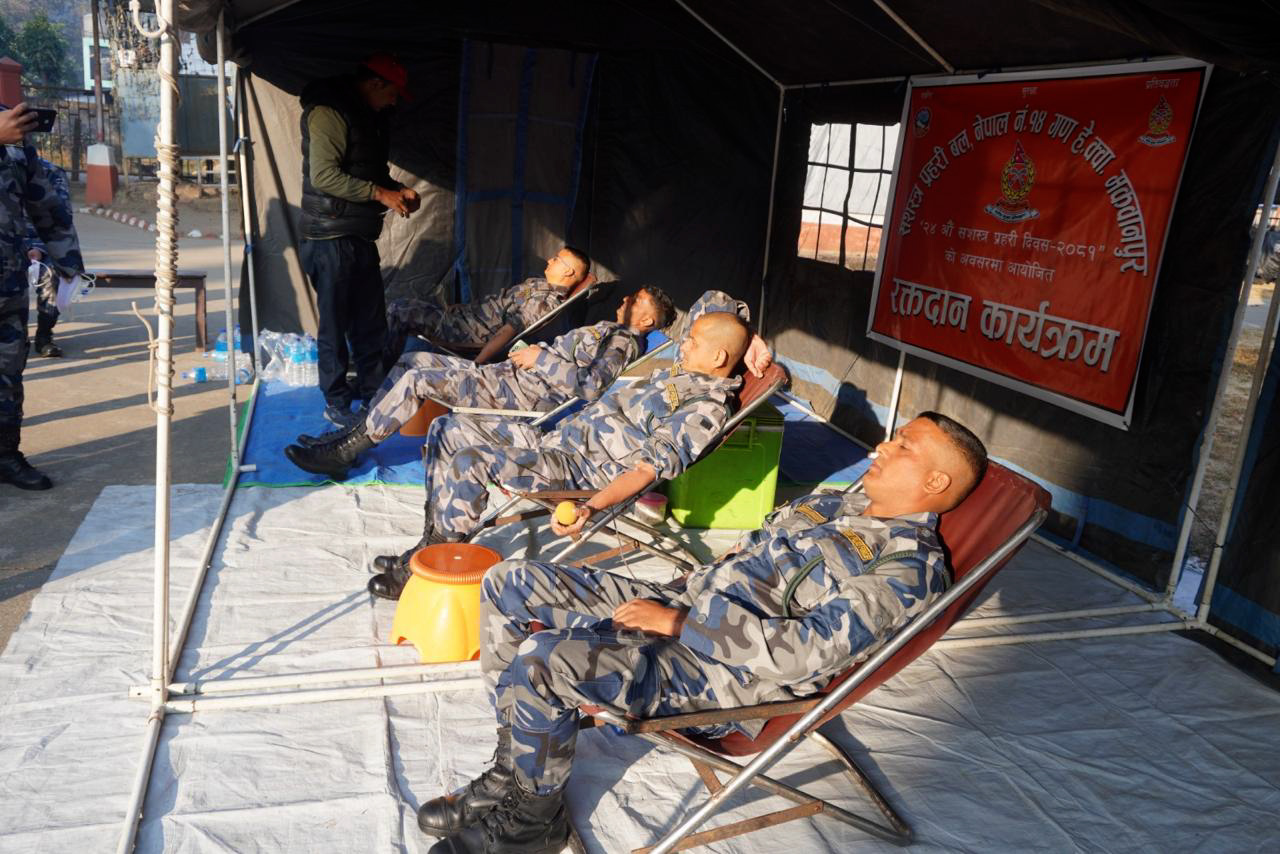 हेटौँडा । २४ औं सशस्त्र प्रहरी दिवसको अवसरमा सशस्त्र प्रहरी बल नेपाल नम्बर १४ गण हेडक्वाटर मकवानपुरले रक्तदान कार्यक्रम गरेको छ । हेटौडा ८ स्थित गण परिसरमा आयोजना गरिएको कार्यक्रममा २८ जनाले रक्तदान गरेको सशस्त्र प्रहरी बल, नेपाल नम्बर १४ गण हेडक्वाटर मकवानपुरका प्रमुख प्रहरी उपरिक्षक ज्ञान प्रसाद भूर्तेलले जानकारी दिए ।
