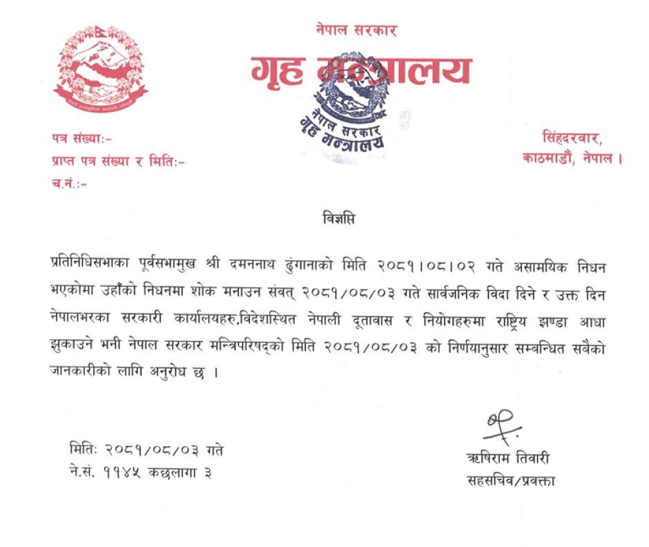 काठमाडौ । पूर्वसभामुख दमननाथ ढुंगानाको निधनमा सरकारले आज सार्वजनिक बिदा दिने निर्णय गरेको छ ।