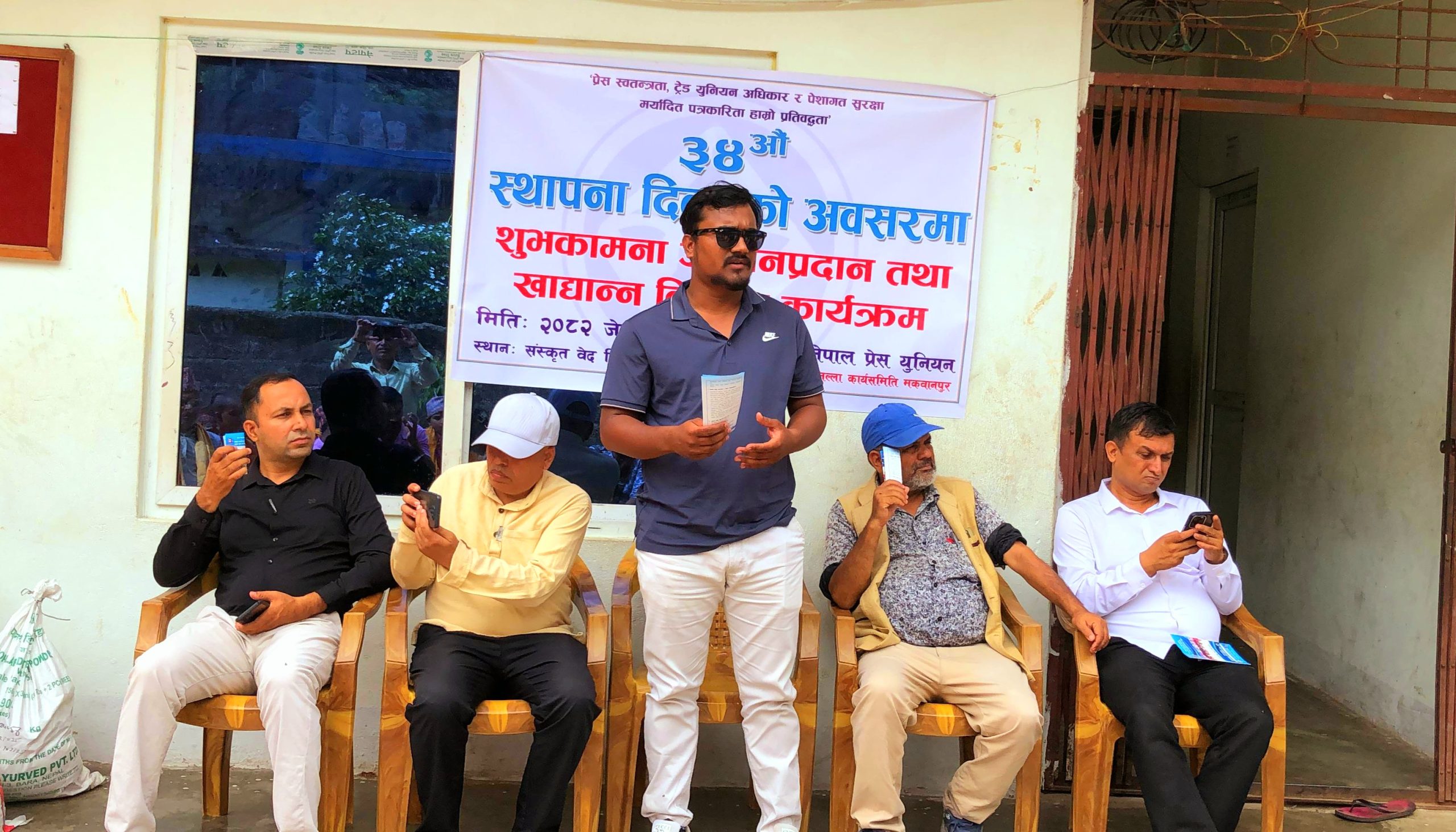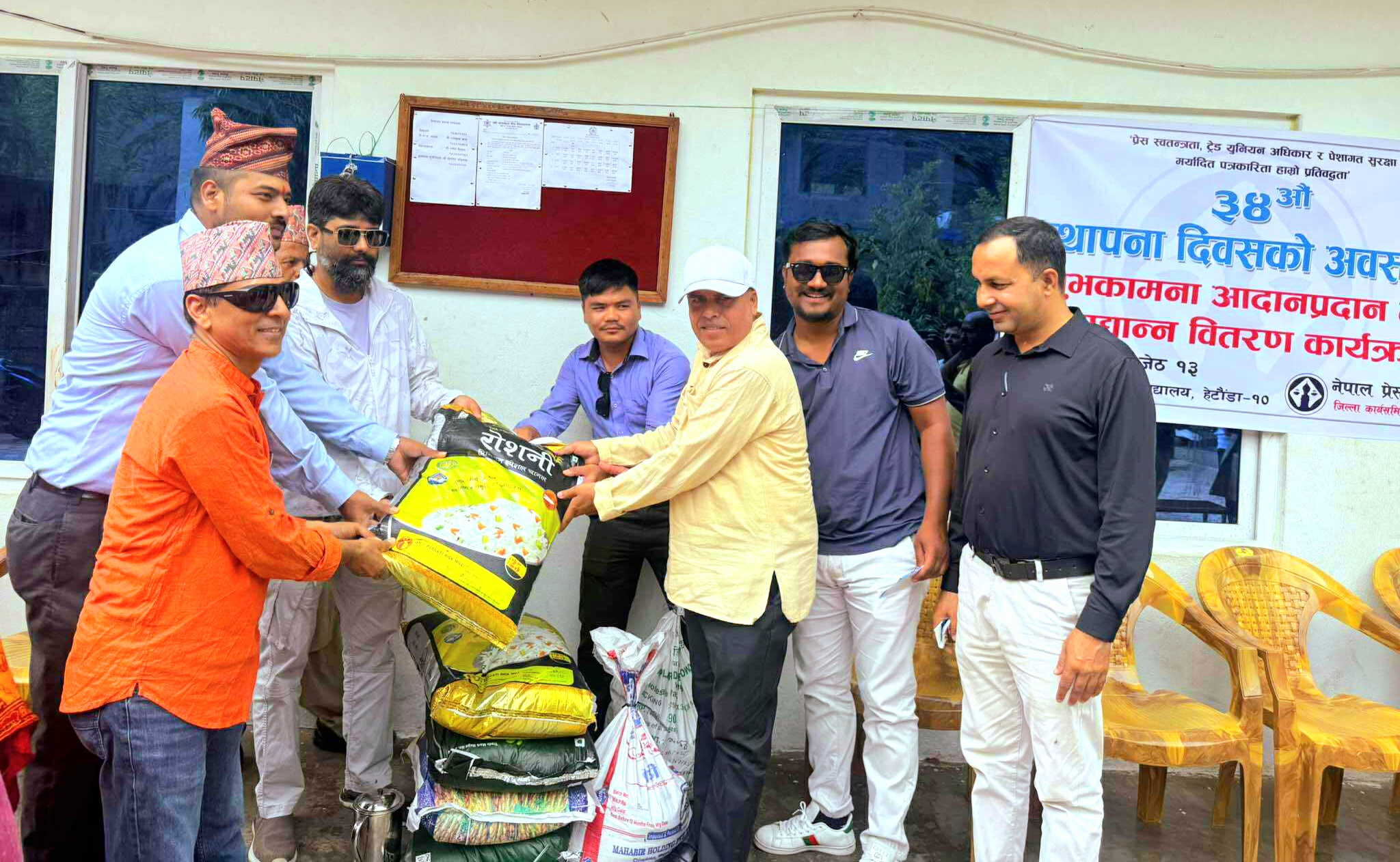 हेटौँडा । नेपाल प्रेस युनियन मकवानपुर शाखाले आफ्नो ३४ औं स्थापना दिवस मनाएको छ । शाखाले सोमबार शुभकामना आदानप्रदान एवम् हेटौंडा उपमहानगरपालिका वडा नम्वर १०, गोरक्षश्वरधामस्थित संस्कृति वेद विद्यालयलाई खाद्यान्न सहयोग गरेर आफ्नो स्थापना दिवस मनाएको हो ।