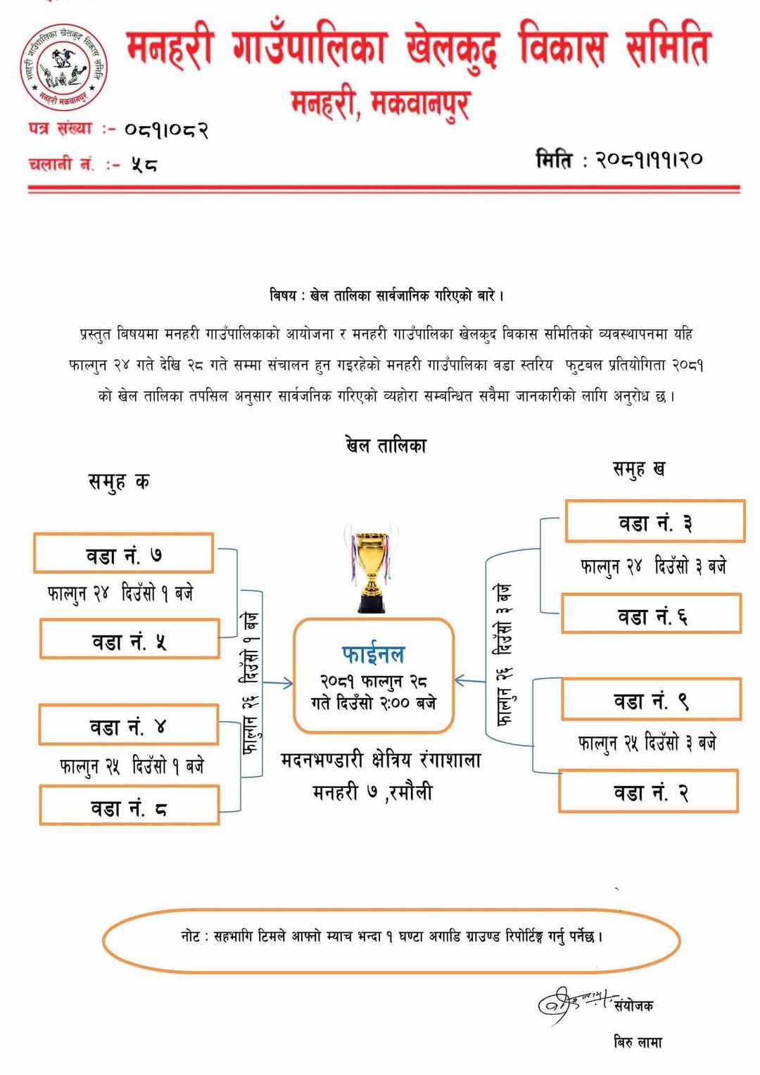मनहरी खेलकुद महोत्सव अन्तर्गत फुटबल र भलिवलको खेल तालिका सार्वजनिक